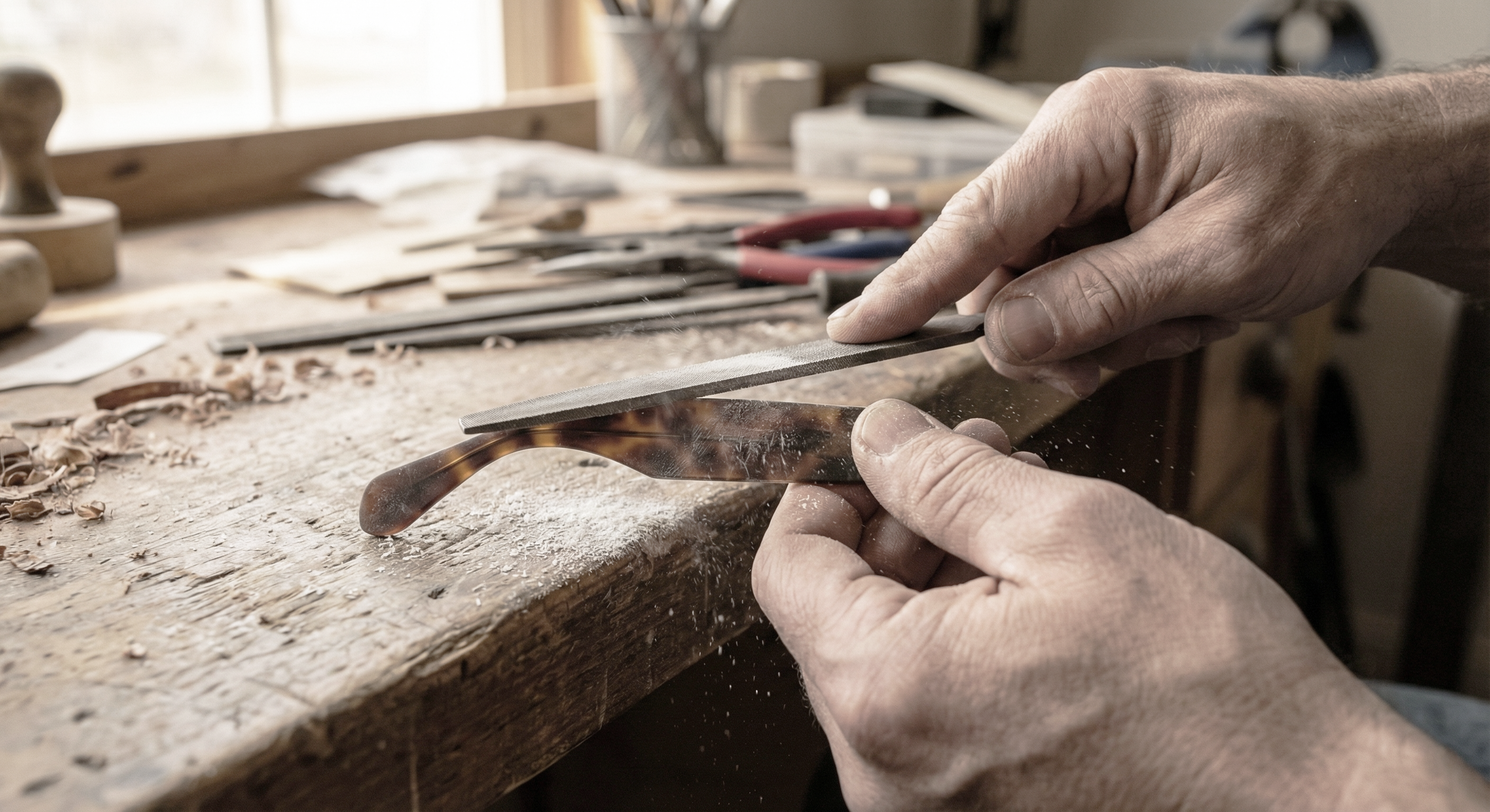 THIS BALANCED COMBINATION OF TECHNOLOGY AND HANDWORK ENSURES THAT EVERY PAIR MAINTAINS THE SAME LEVEL OF BALANCE, COMFORT, AND FINISH — FRAME AFTER FRAME.